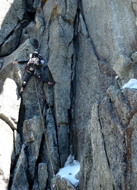 Bien por la mañana despertamos con las primeras luces y volvemos al trabajo rutinario de montar rápel-desmontar rápel. Mikeltxo disfruta como un enano buscando y montando rápeles mientras Tato, Juanjo y yo hacemos los trabajos de recuperación y desmonte. Poco a poco descendemos los mil metros hasta el glaciar de la Charpoua con alguna grieta interesante y en el que interesa llevar grampones aunque la nieve esté húmeda...